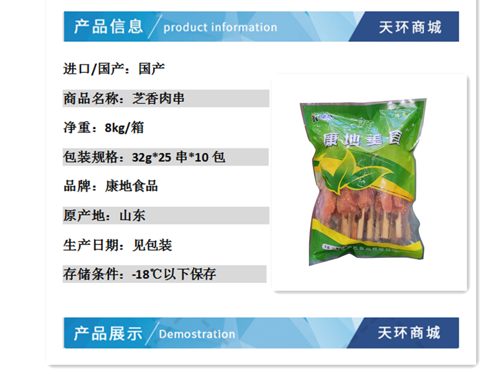 商品名称:【康地】芝香肉串 30g*25串*10包 7.5kg