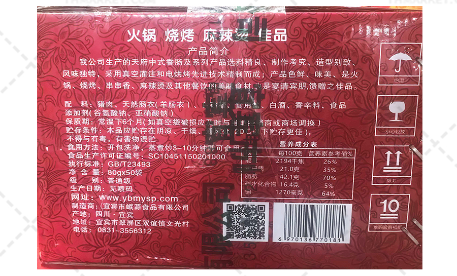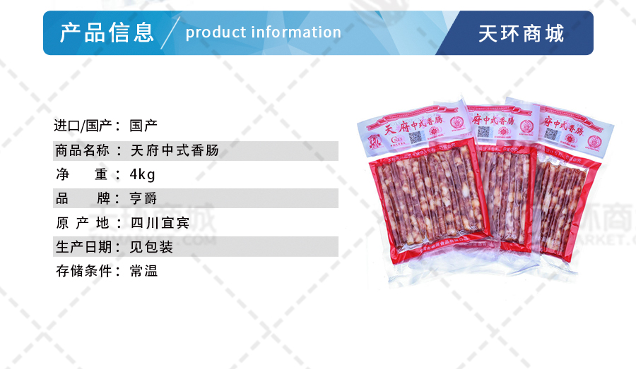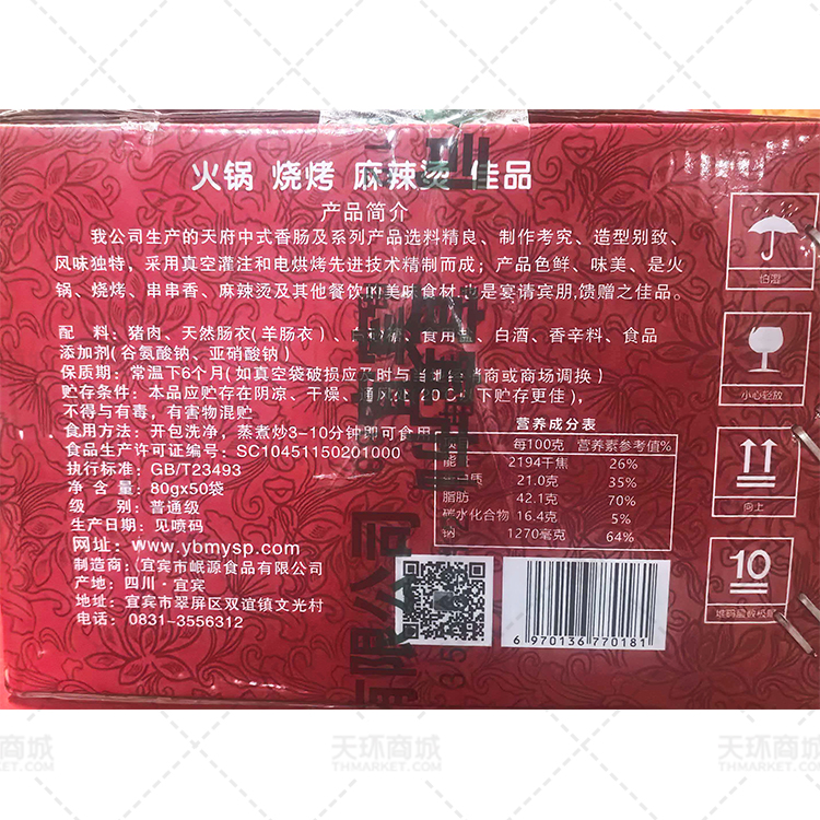 商品名称:【享爵】【常温】天府中式香肠(宜宾小香肠,笔肠,火锅小香肠)80g*50袋 4kg