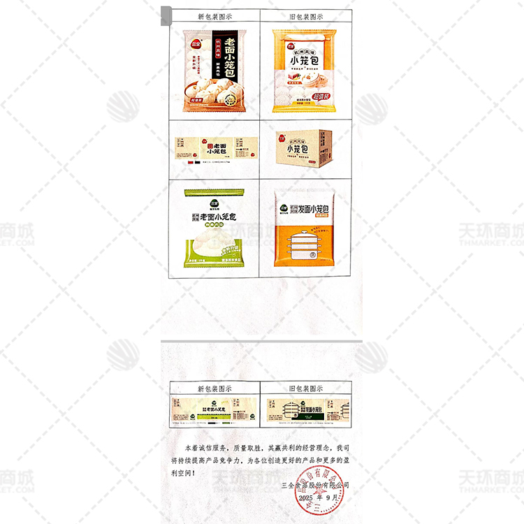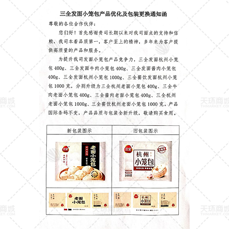 三全公司产品包装升级,旧包装名称为:杭州风味发面小笼包;新包装名称为:杭州风味老面小笼包。老面工艺,口感更劲道。